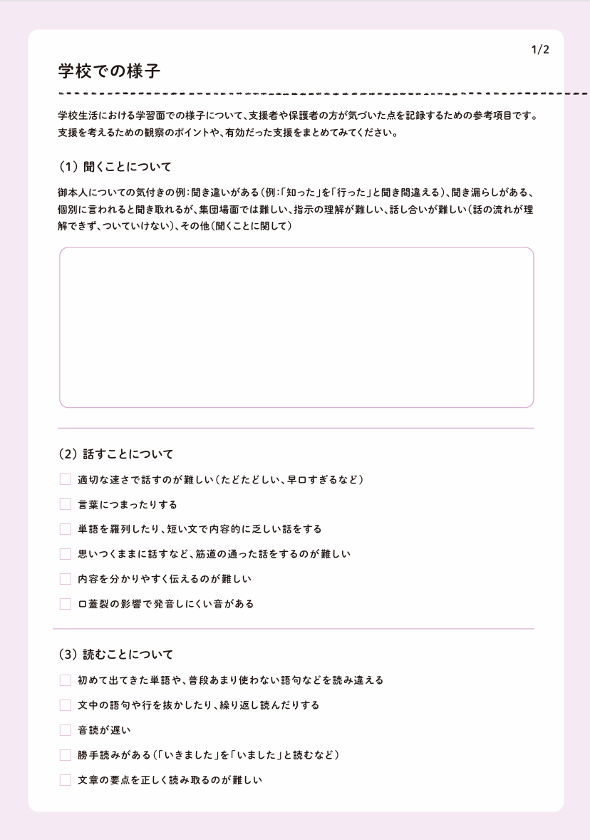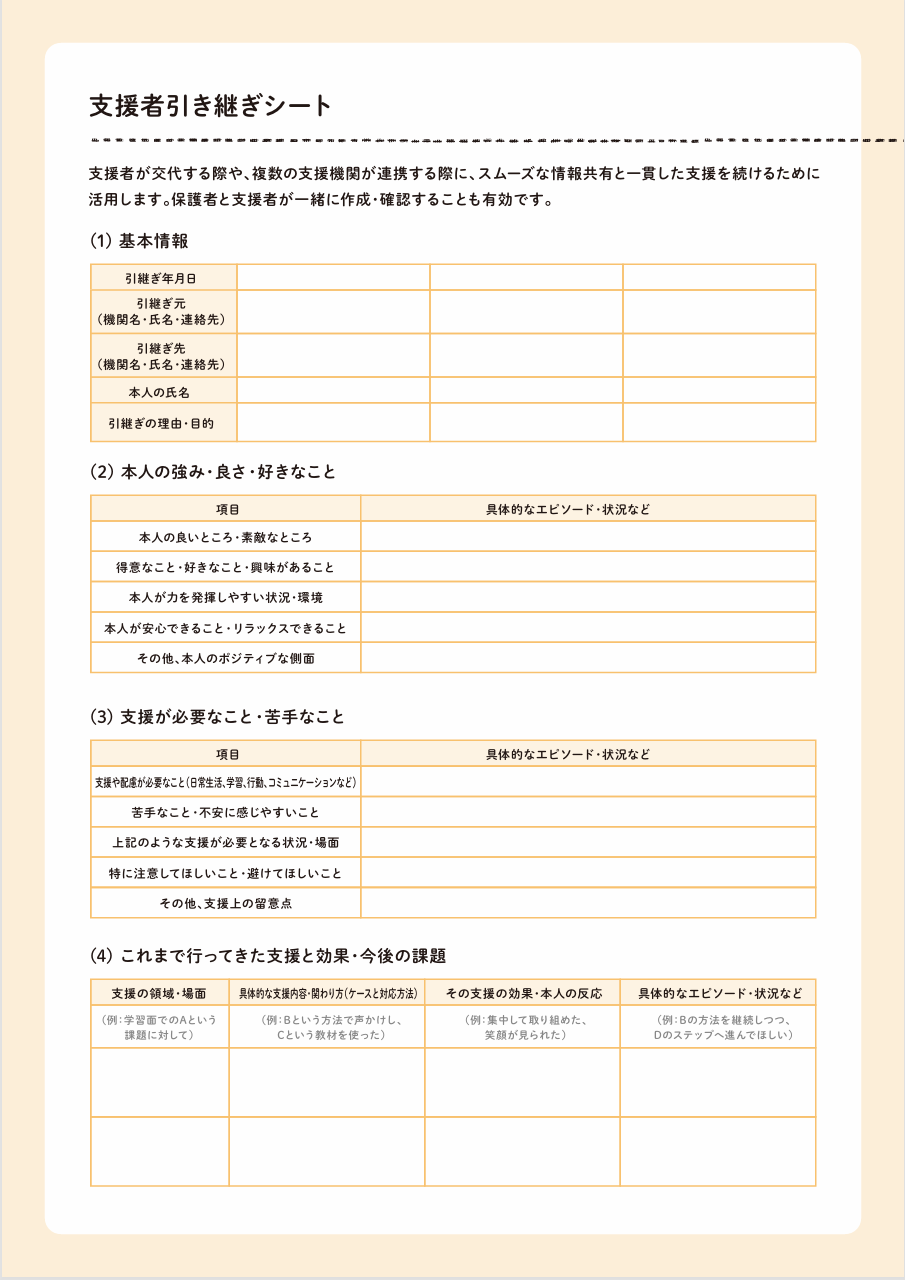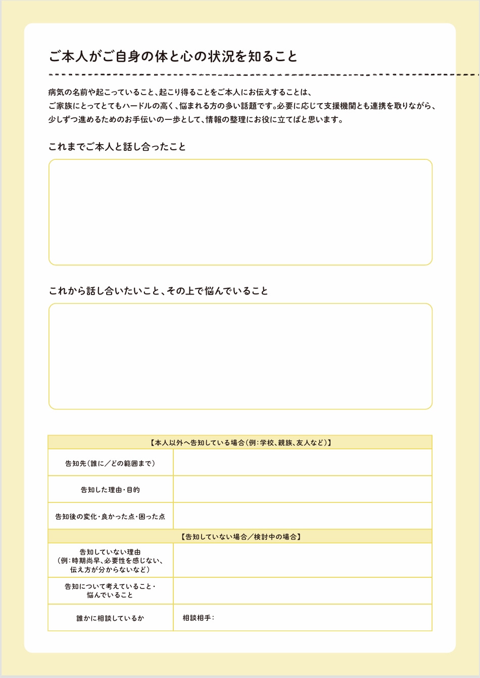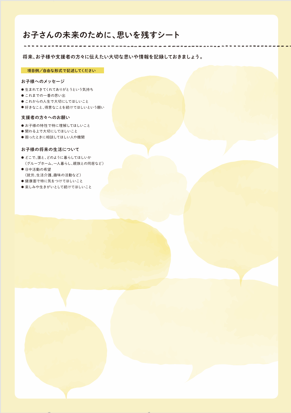 お子さんやご本人の状況は一人ひとり異なります。すべての項目を埋める必要はありません。そのときどきで必要な情報を書き込み、医療・福祉・教育・就労など、さまざまな場面で関わる方々に見せながらお使いください。入学や就職といったライフステージの節目で、これまでの歩みをふり返ったり、これからのことを一緒に考えたりするきっかけとしてもご活用いただけます。