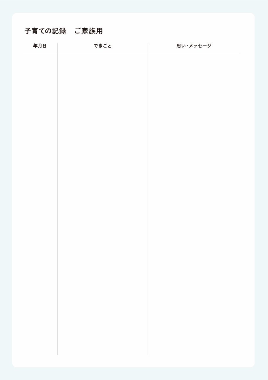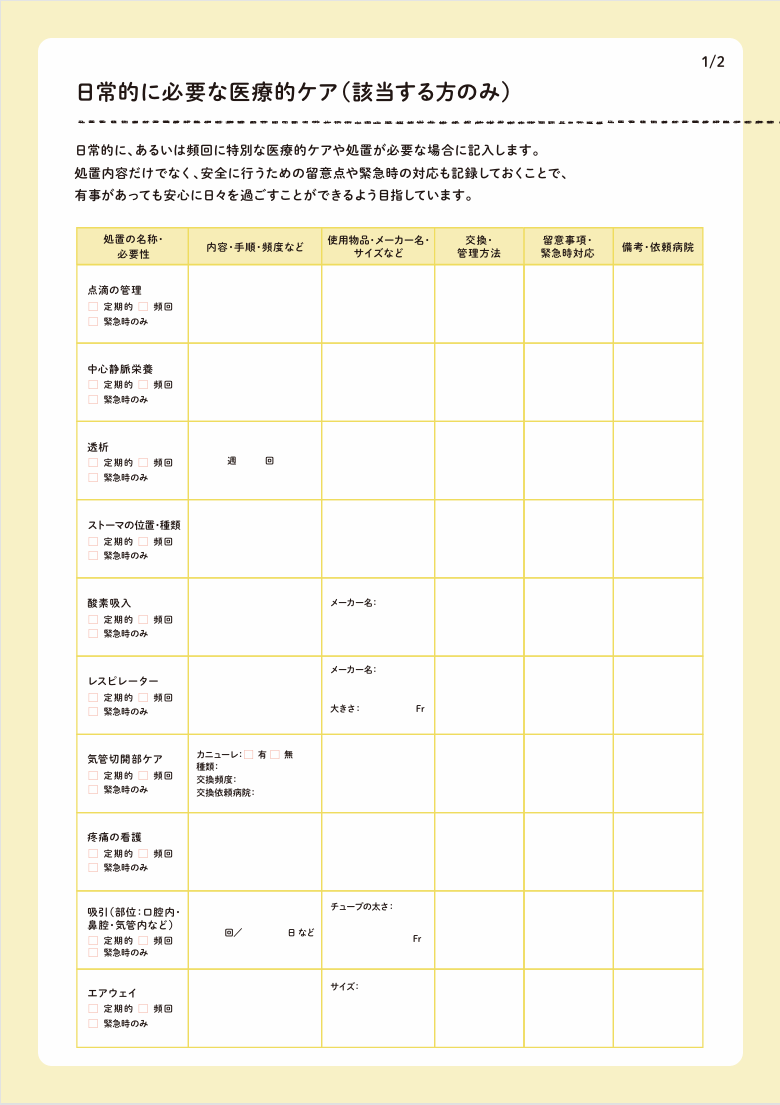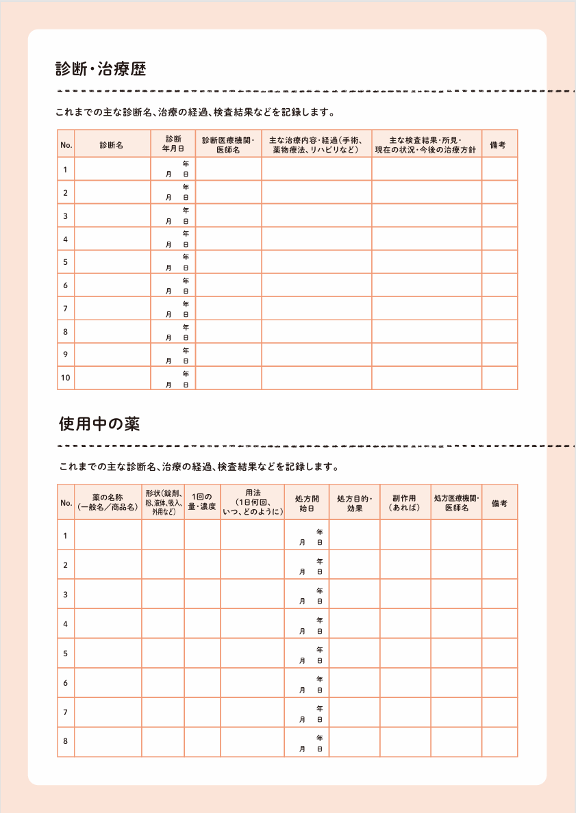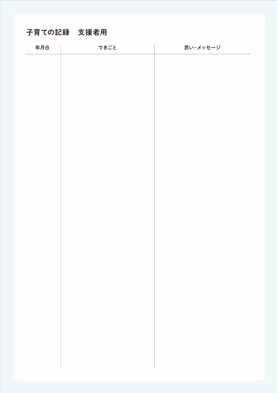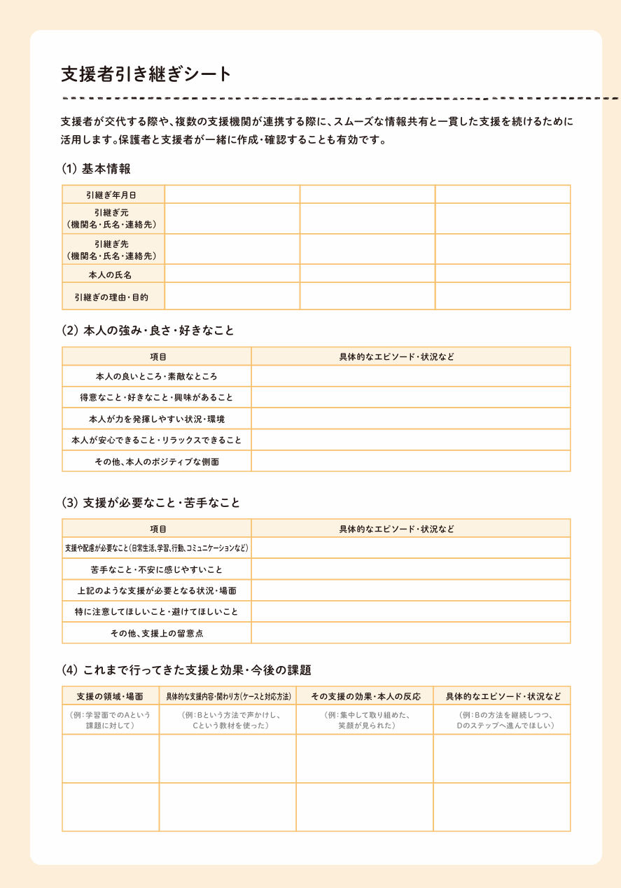 お子さんやご本人の状況は一人ひとり異なります。すべての項目を埋める必要はありません。そのときどきで必要な情報を書き込み、医療・福祉・教育・就労など、さまざまな場面で関わる方々に見せながらお使いください。入学や就職といったライフステージの節目で、これまでの歩みをふり返ったり、これからのことを一緒に考えたりするきっかけとしてもご活用いただけます。